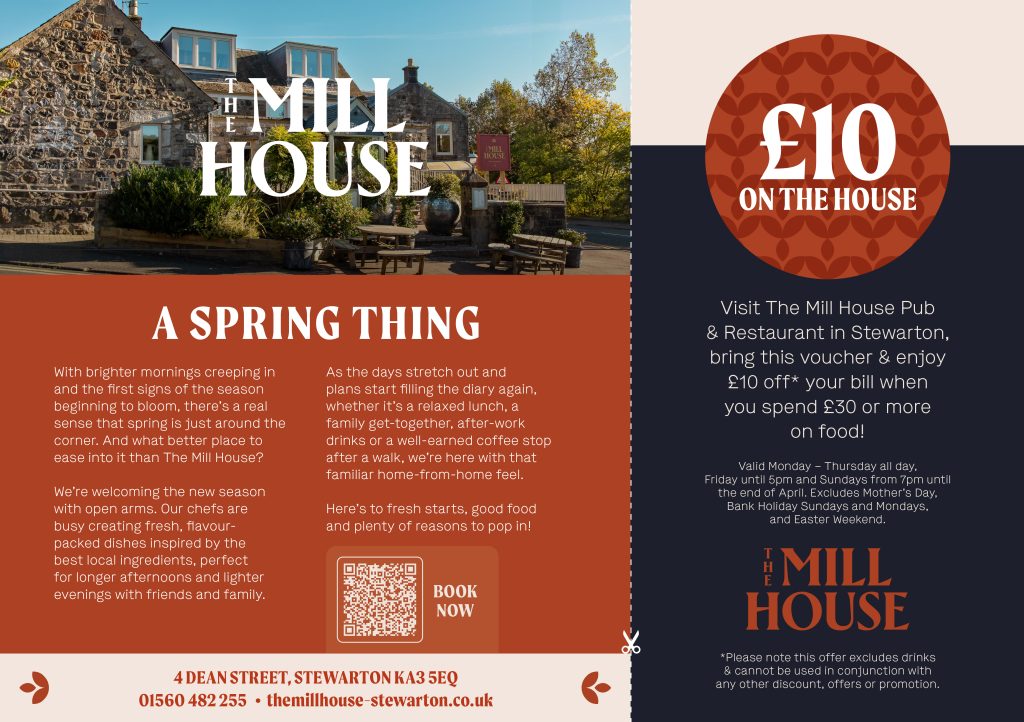 A stylish all-day destination in the heart of Stewarton, The Mill House is home to a bustling restaurant, laid-back pub and intimate private dining room